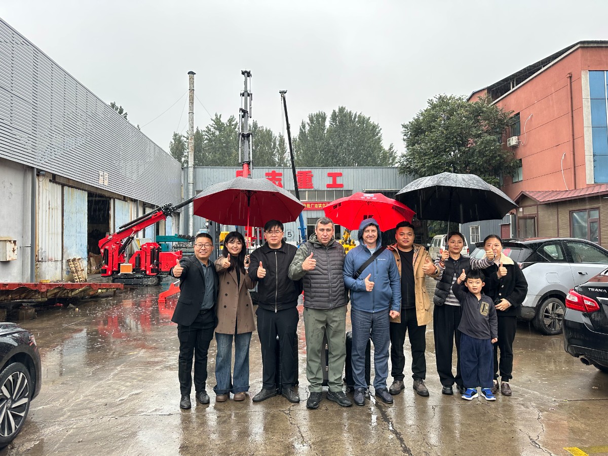 (俄羅斯客戶在雨中與星志重工工作人員合影留念)